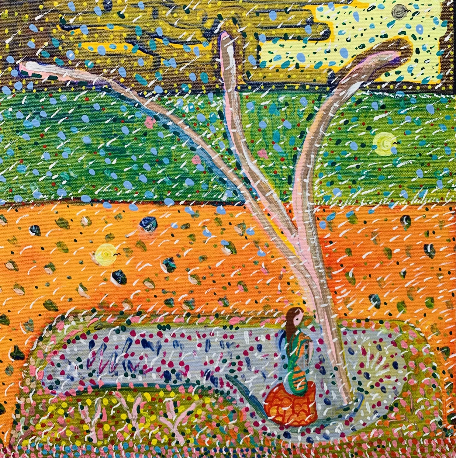 Kavanayén, leyendo a orillas del Orinoco river. 2025  Gouache on canvas 20 × 20 in 51 × 51 cm