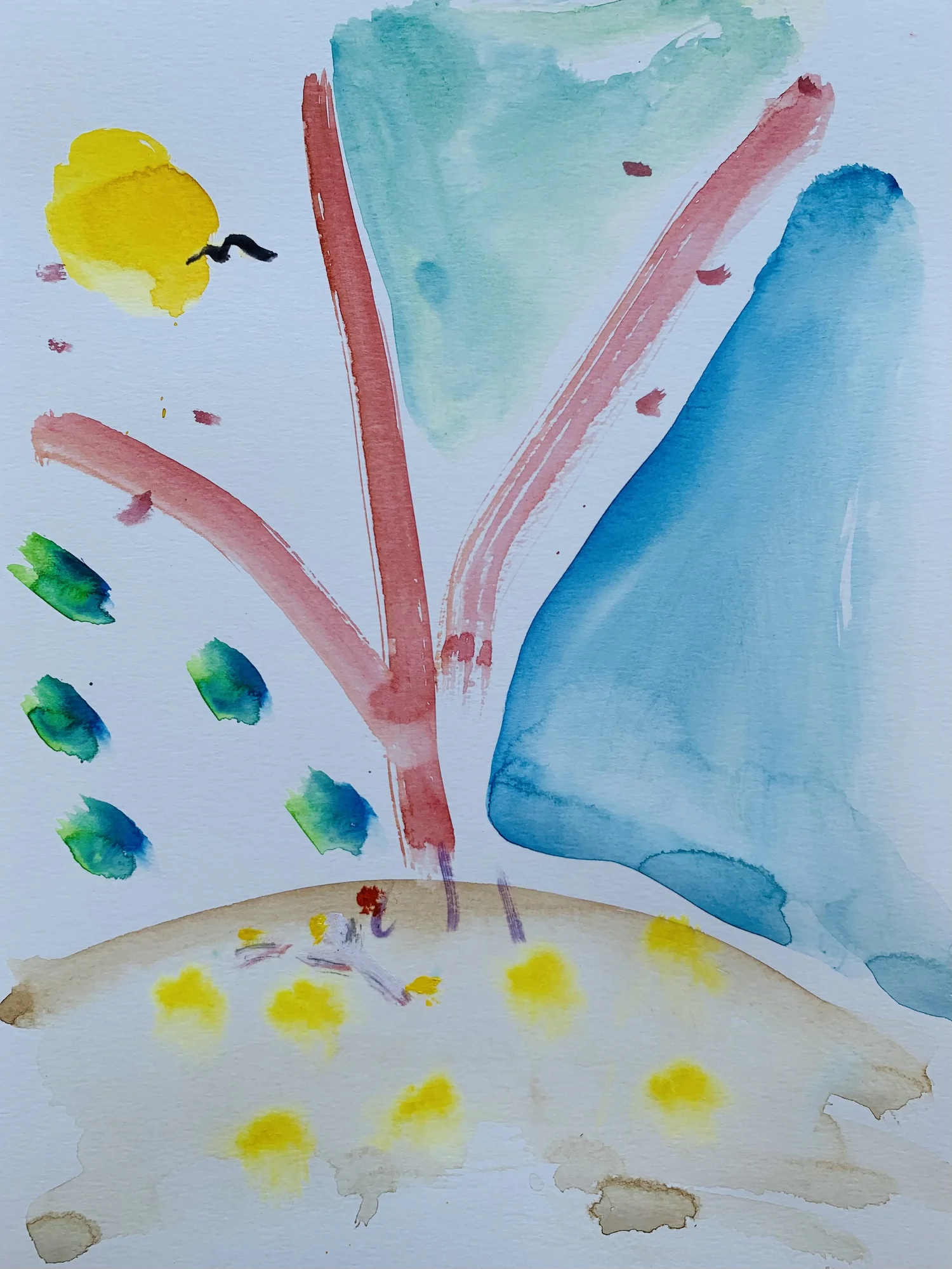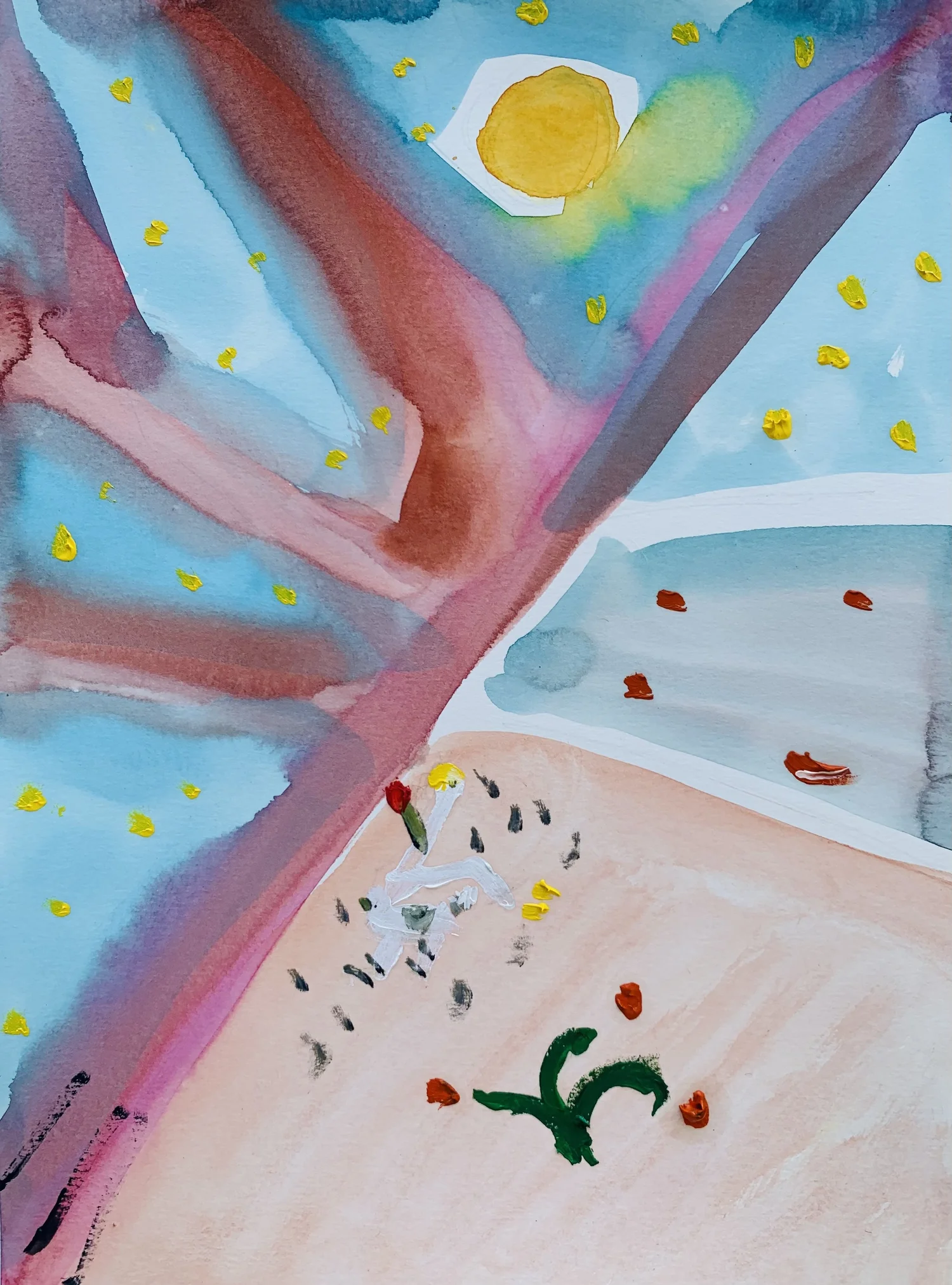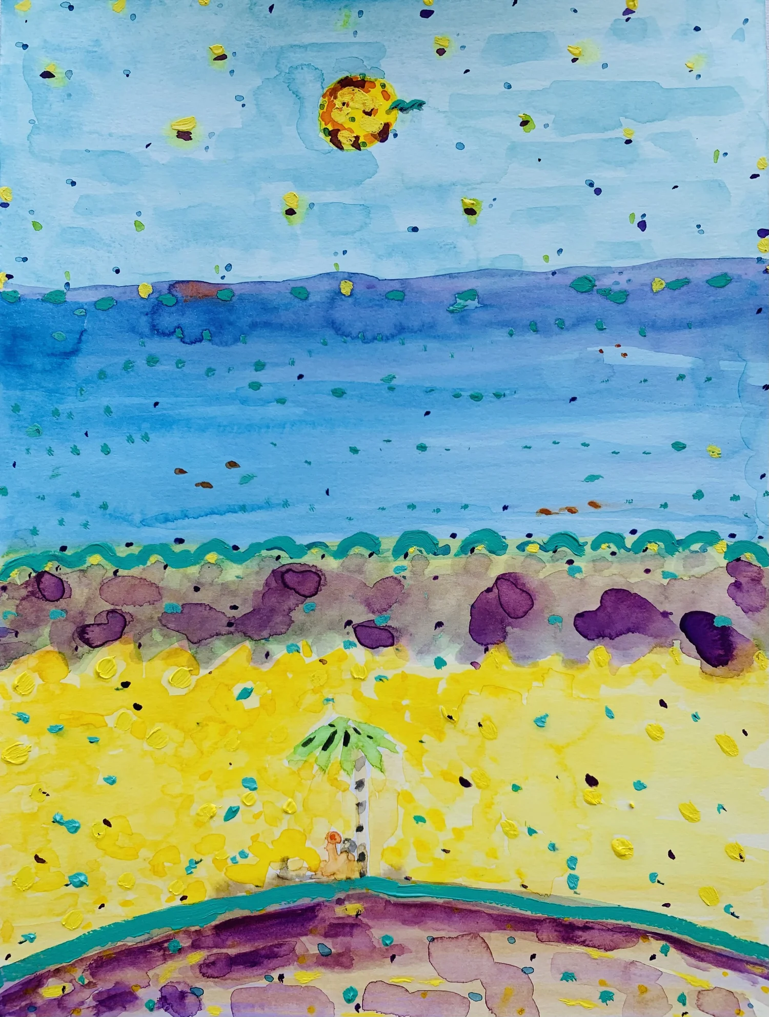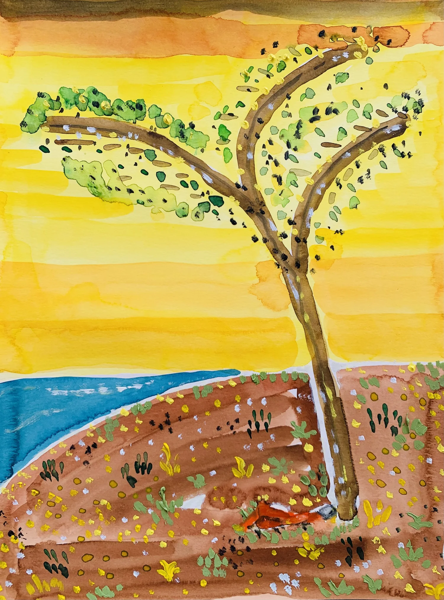 Kavanayén, bajo el árbol inclinado. 2025  Water color and oil on paper 9 x 12 in 22.9 x 30.5 cm