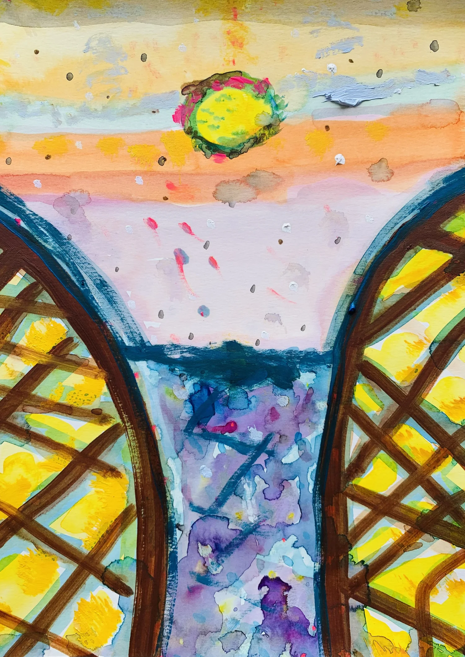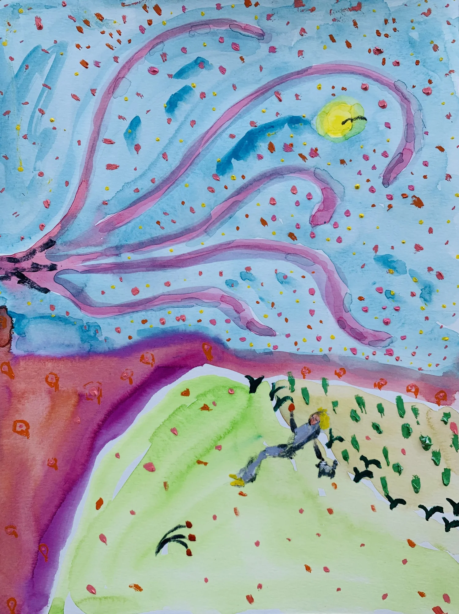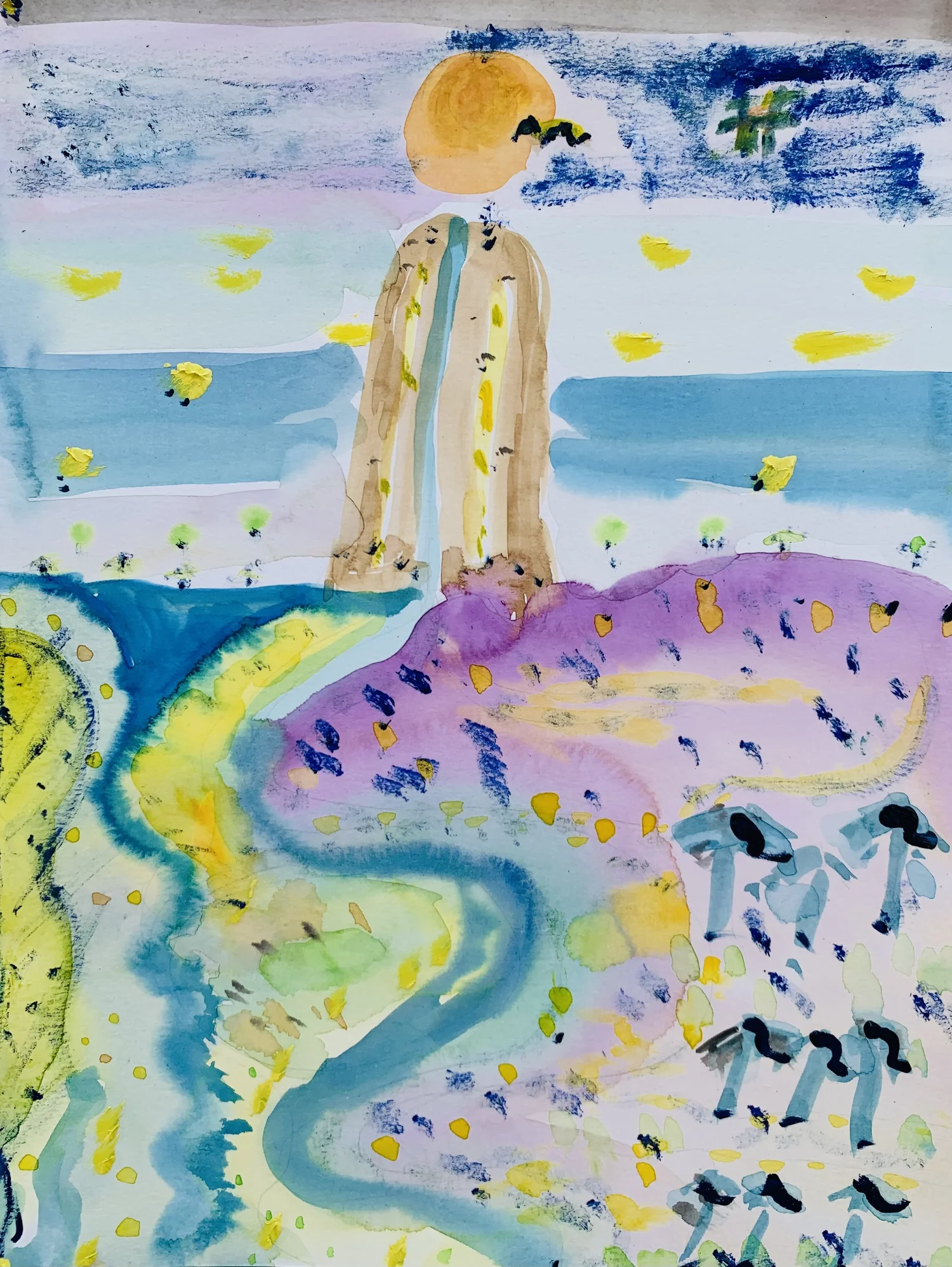 Kavanayén, luna flourecente. 2025  Water color and oil on paper 9 x 12 in 22.9 x 30.5 cm