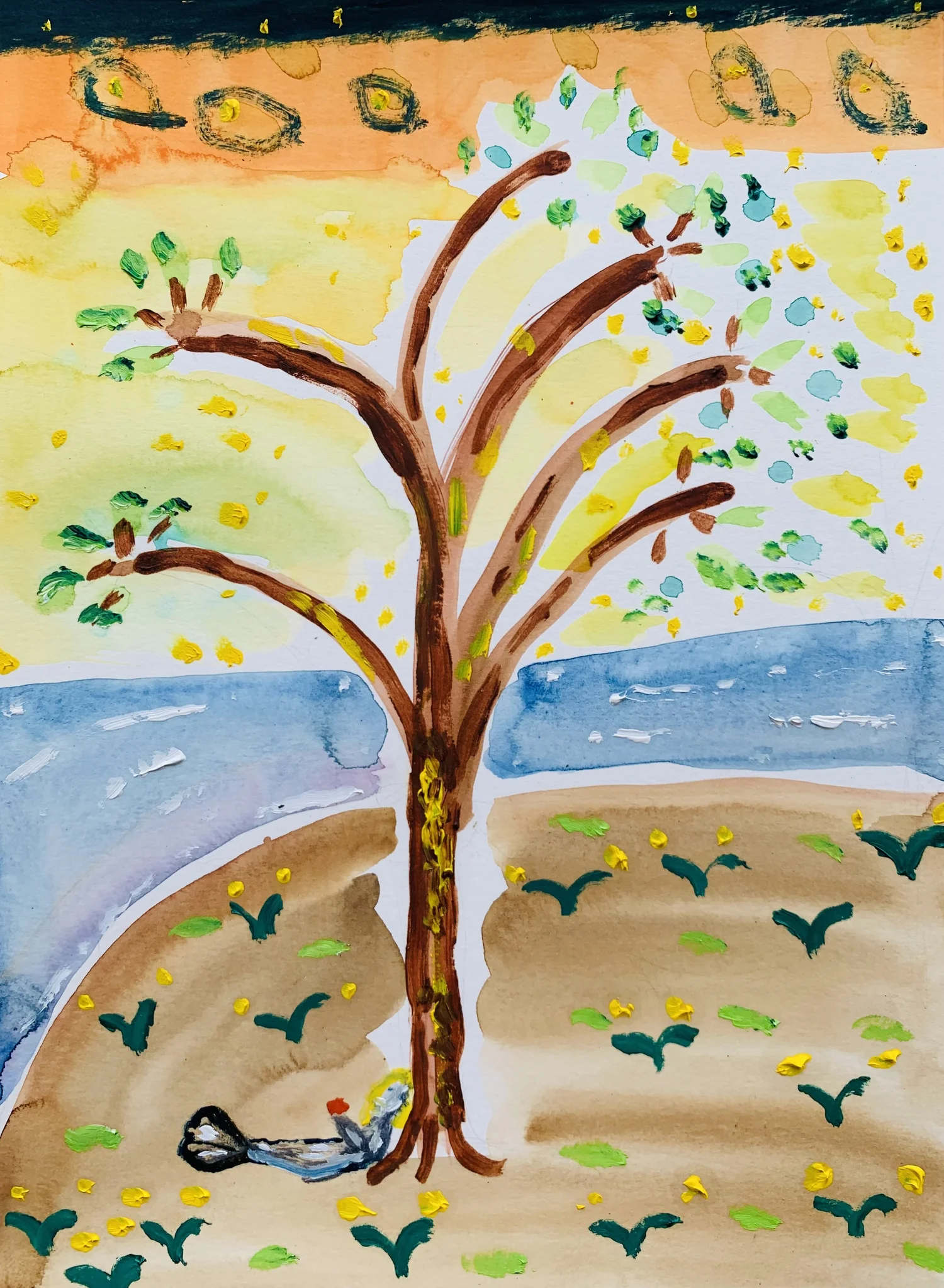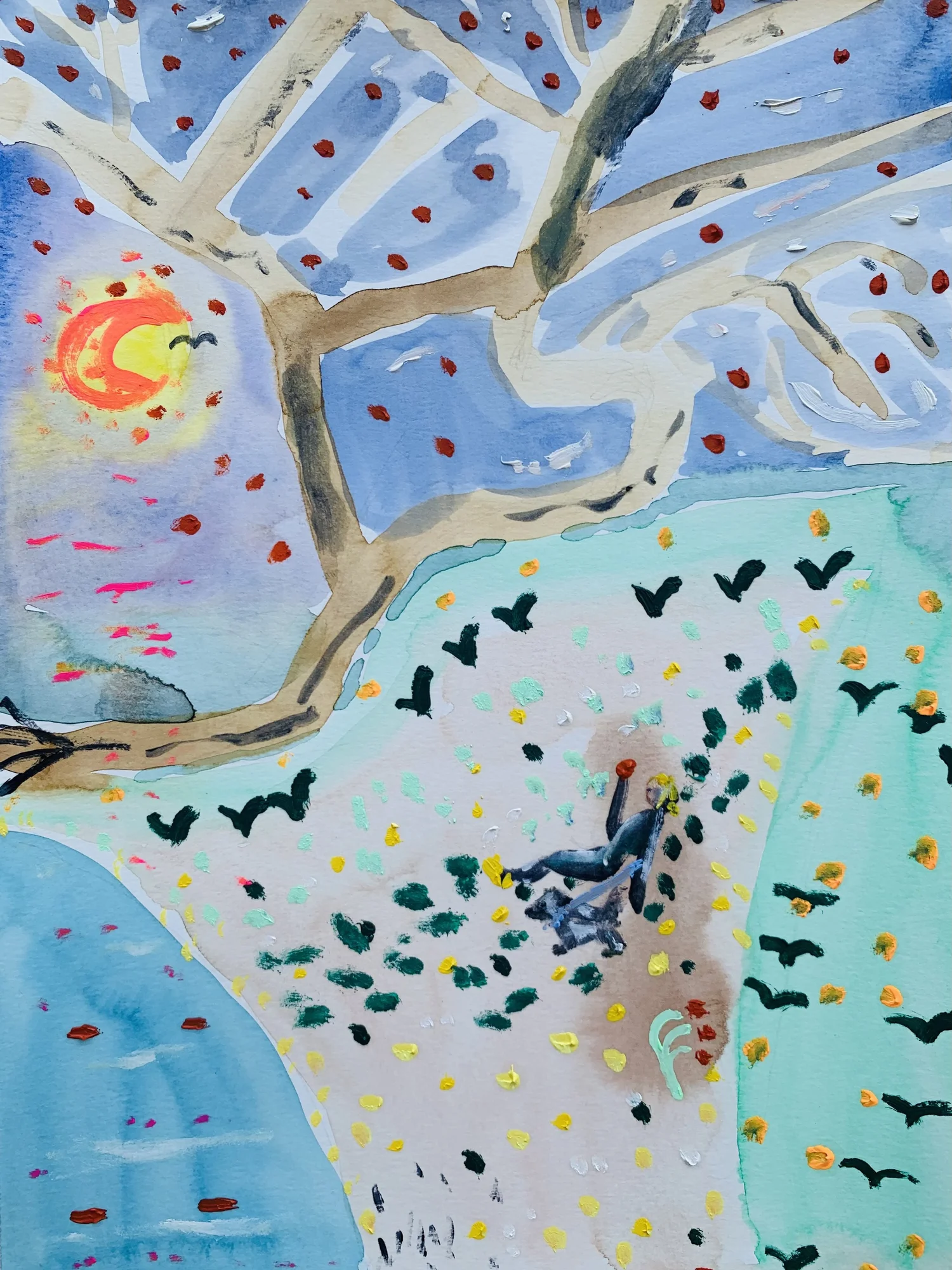 Kavanayén, leyendo bajo el árbol. 2025  Water color and oil on paper 9 x 12 in 22.9 x 30.5 cm